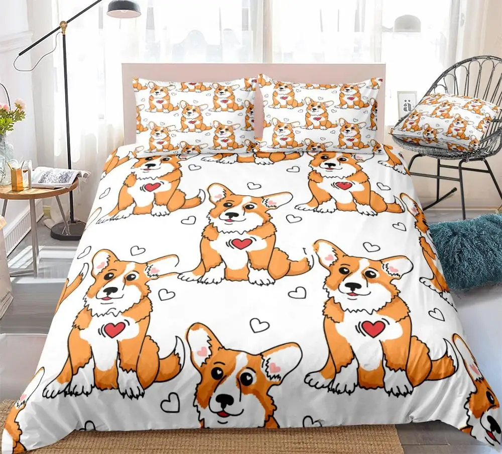 - Ropa de cama de dibujos animados para niños y niñas, juego de edredón con diseño de perros Corgi, corazones rojos y blancos, juego de cama para mascotas, envío directo