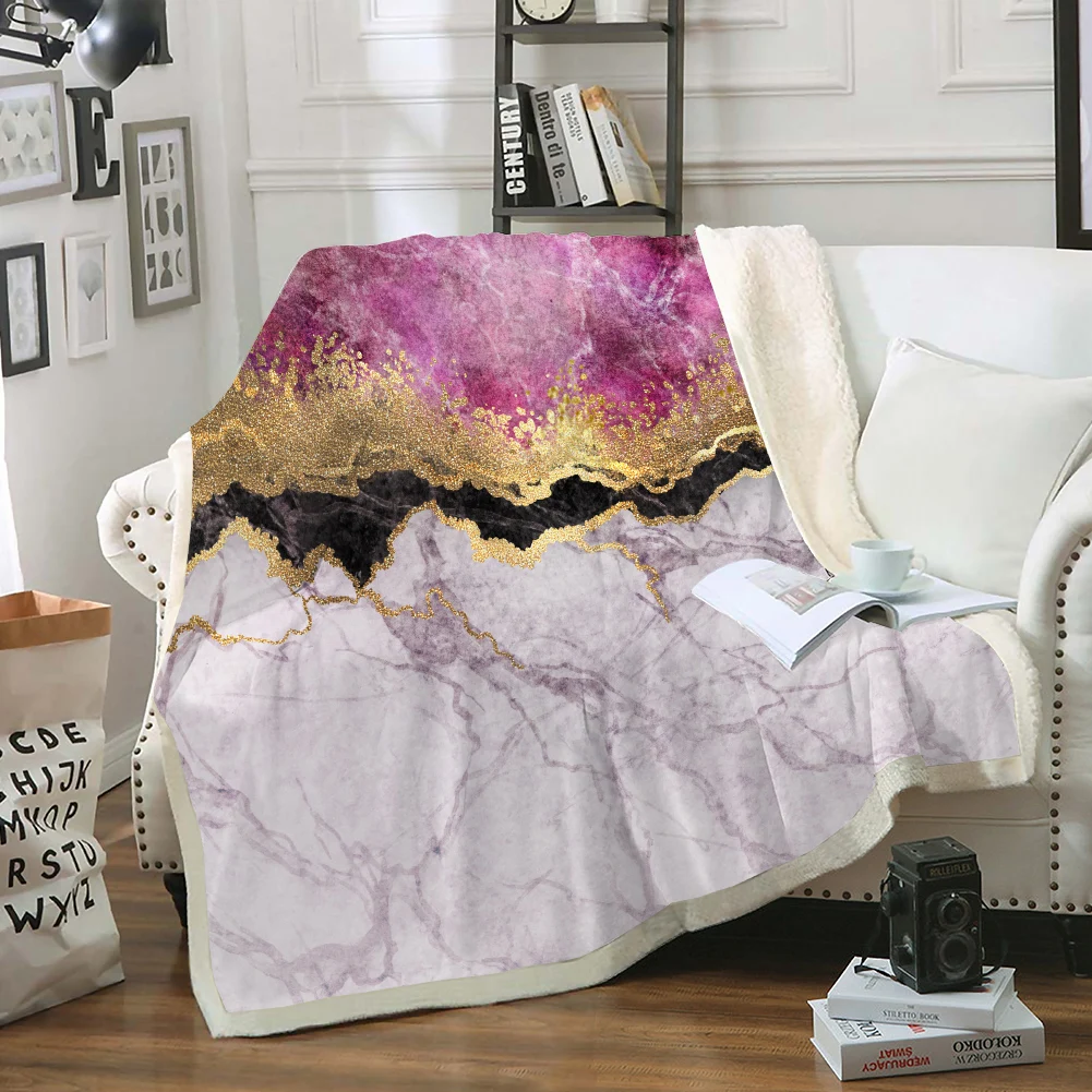 - Manta de vellón con estampado de mármol, manta suave y cálida con textura de mármol dorado púrpura para cama, sofá y sofá