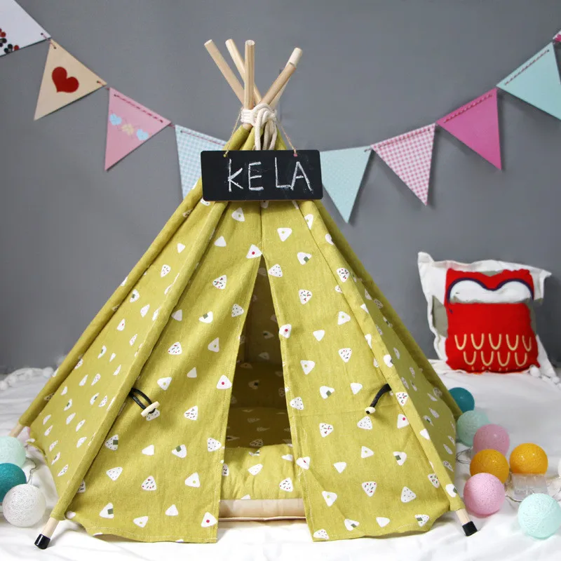 - Tienda de campaña para mascotas, tipi de lona amarilla con cojín, para cachorros y gatos, 30 pulgadas de alto, hasta 15 libras