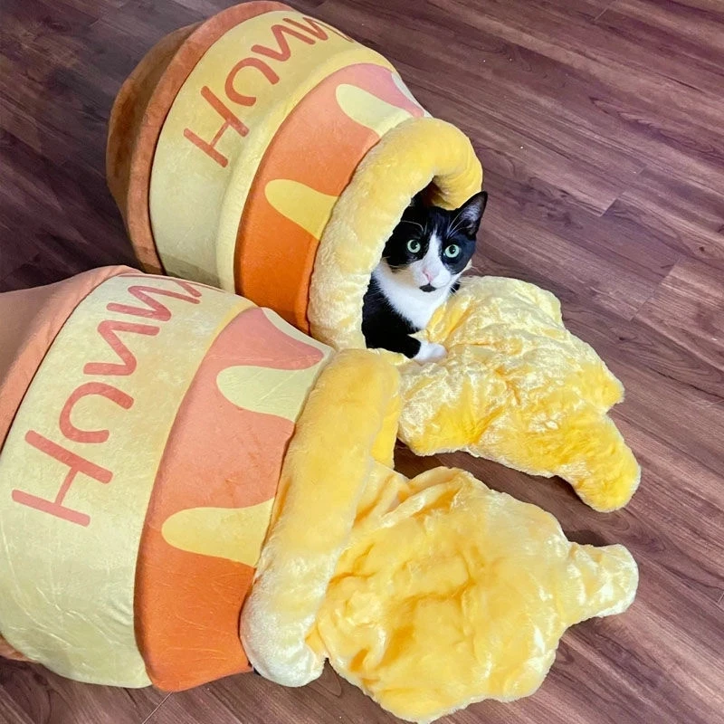 - Cama con forma de tarro de miel para gato, cama de felpa bonita con dibujos animados, cálida, casa, esterilla, nido suave para mascotas pequeñas