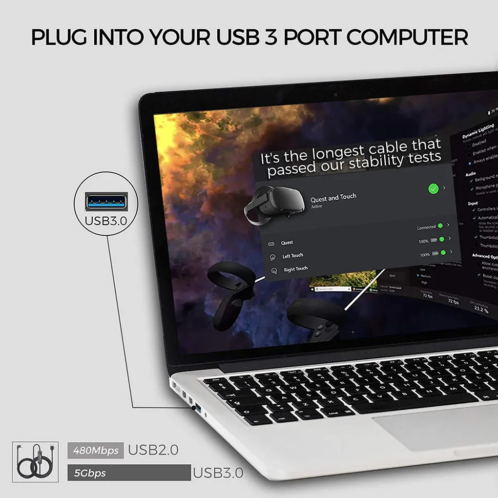 - Cable de extensión de VR totalmente funcional, Cable USB de 8M/ 26 pies, línea de datos estable tipo A C, USB para Oculus Quest Link Steam VR, accesorios